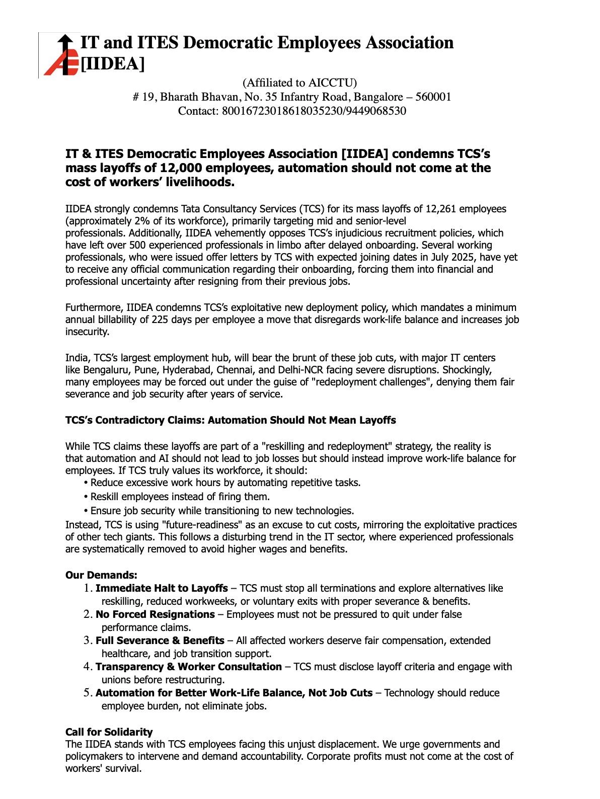 IT & ITES Democratic Employees Association (IIDEA) condemns TCS’s mass layoffs of 12,000 employees, automation should not come at the cost of workers’ livelihoods. Our Demands: Immediate Halt to Layoffs–TCS must stop all terminations and explore alternatives like reskilling, reduced workweeks, or voluntary exits with proper severance & benefits. No Forced Resignations – Employees must not be pressured to quit under false performance claims. Full Severance & Benefits – All affected workers deserve fair compensation, extended healthcare, and job transition support. Transparency & Worker Consultation – TCS must disclose layoff criteria and engage with unions before restructuring. Call for Solidarity The IIDEA stands with TCS employees facing this unjust displacement. We urge governments and policymakers to intervene and demand accountability. Corporate profits must not come at the cost of workers’ survival. Automation for Better Work-Life Balance, Not Job Cuts – Technology should reduce employee burden, not eliminate jobs.