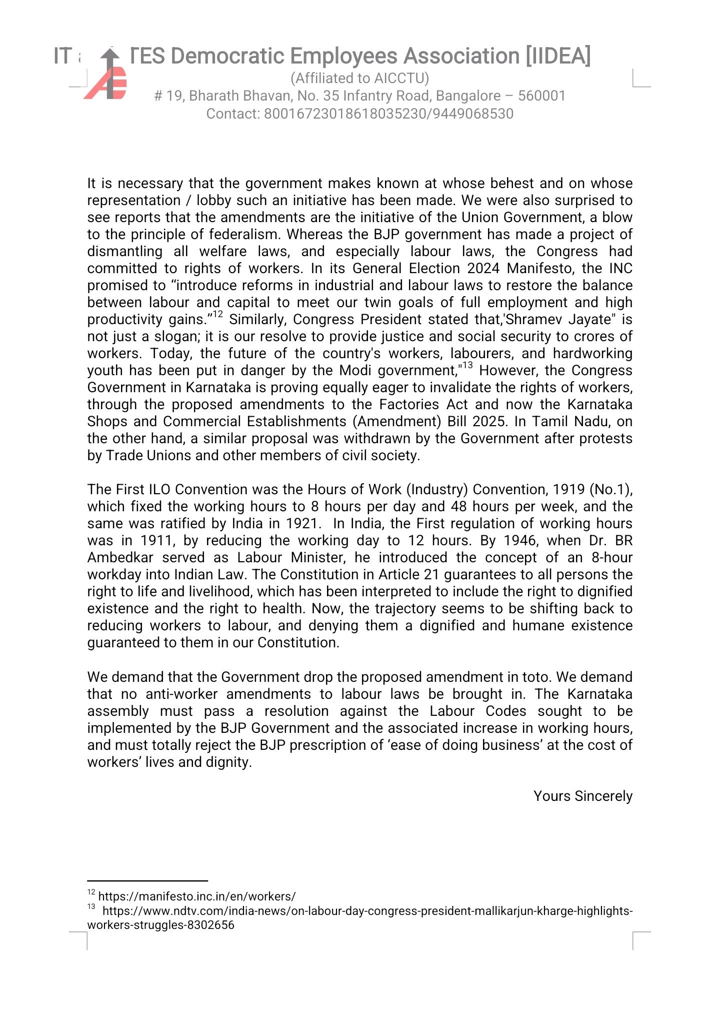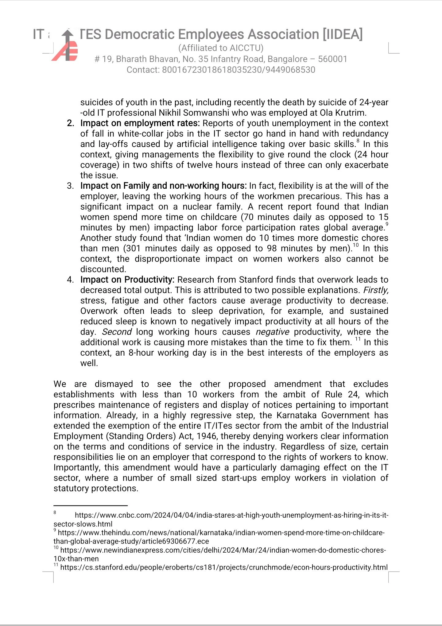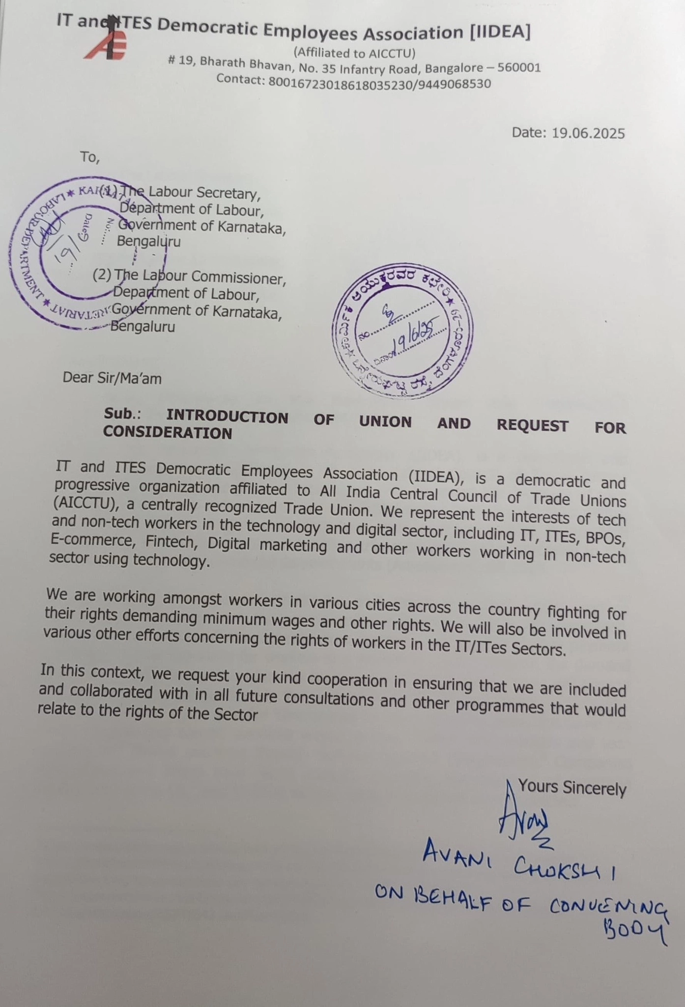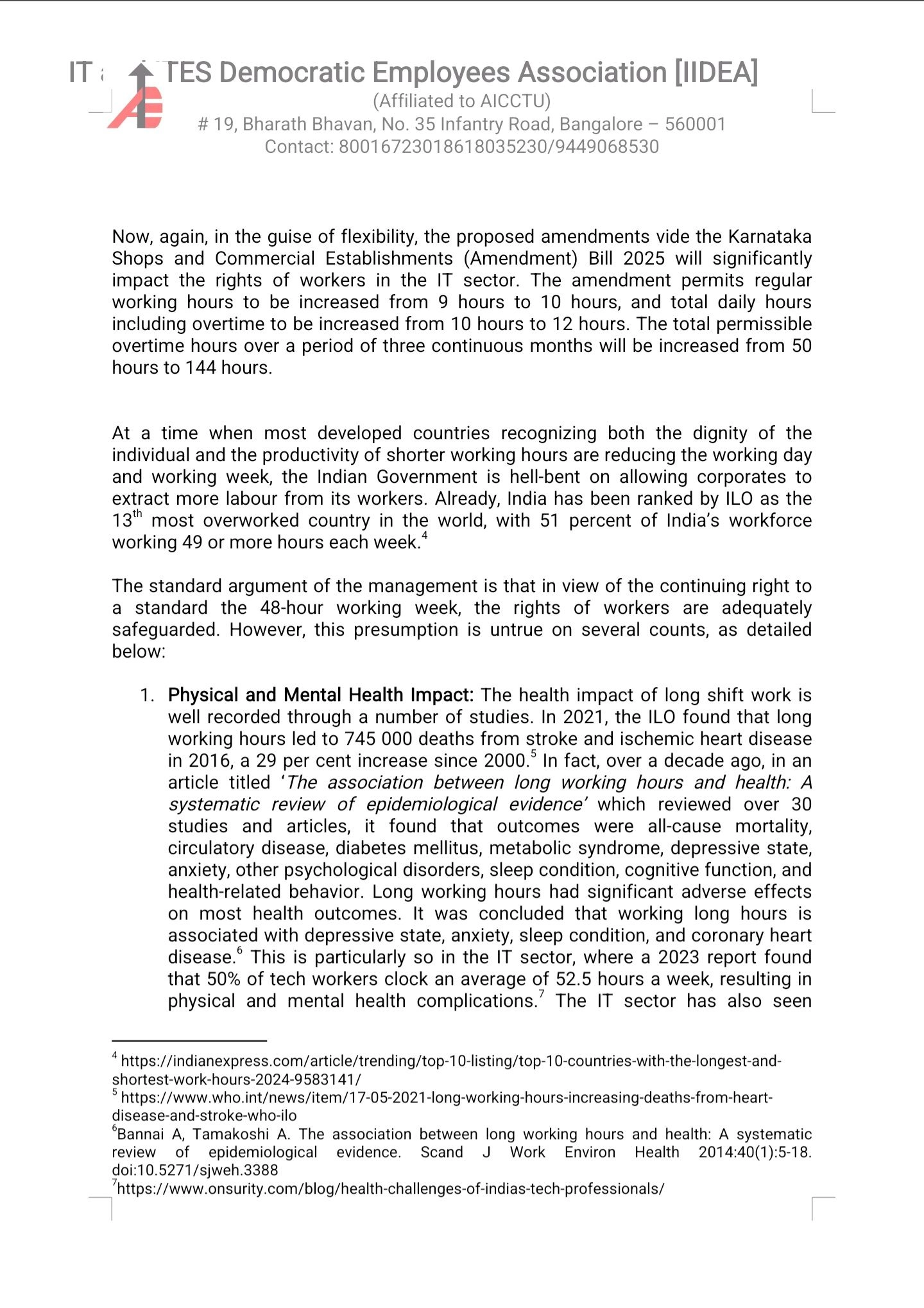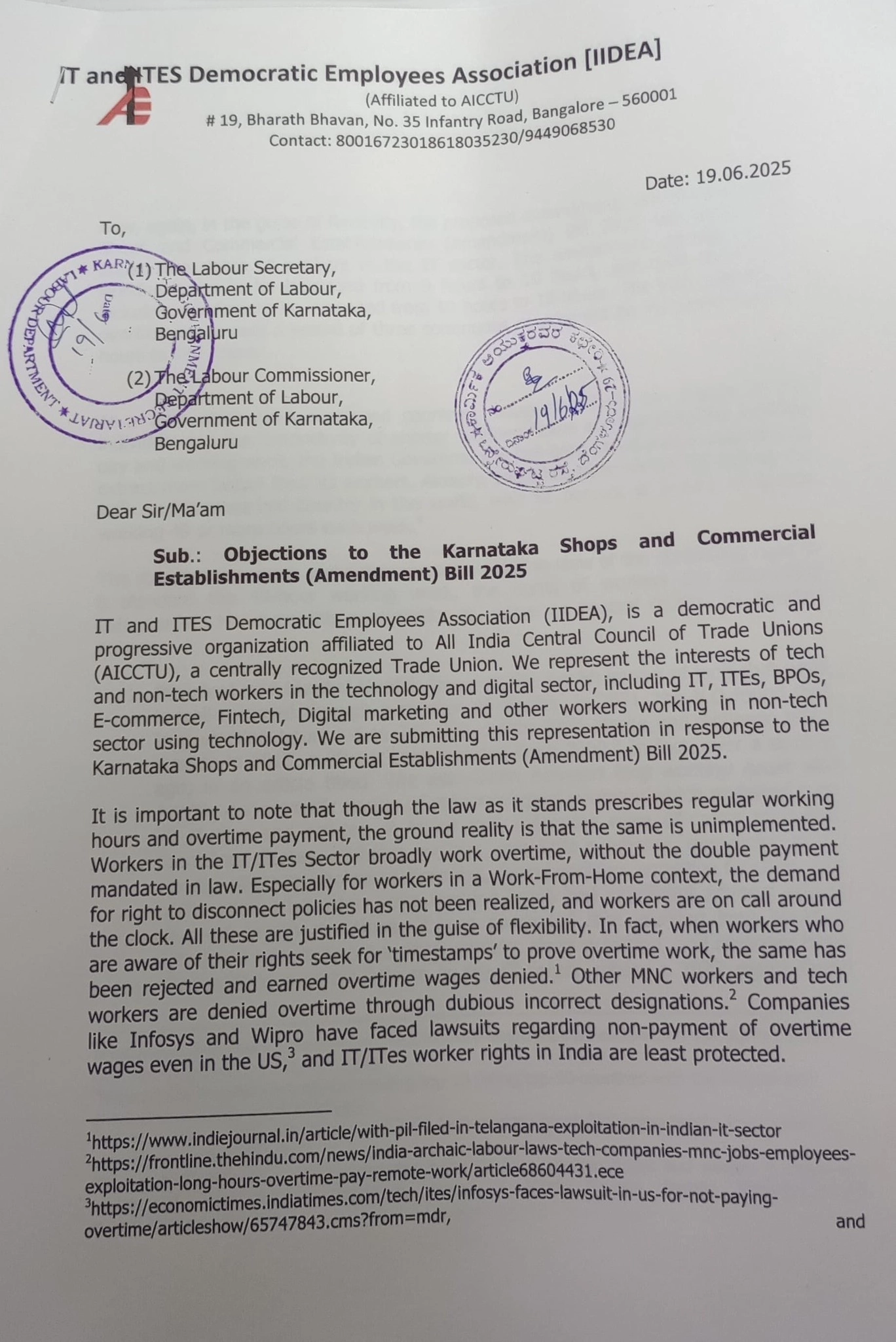 Today, IIDEA members submitted an objection letter to the Labour Secretary and Labour Commissioner of Karnataka opposing the Karnataka Shops & Establishments (Amendment) Bill 2025. The bill seeks to extend daily working hours to 10, with up to 12 hours including overtime. This is a direct attack on the rights, health, and dignity of workers across the IT, ITeS, BPO, e-commerce, fintech, and digital sectors. In a country already ranked among the most overworked in the world, this amendment will push workers into burnout, exploitative schedules, and reduced job opportunities.